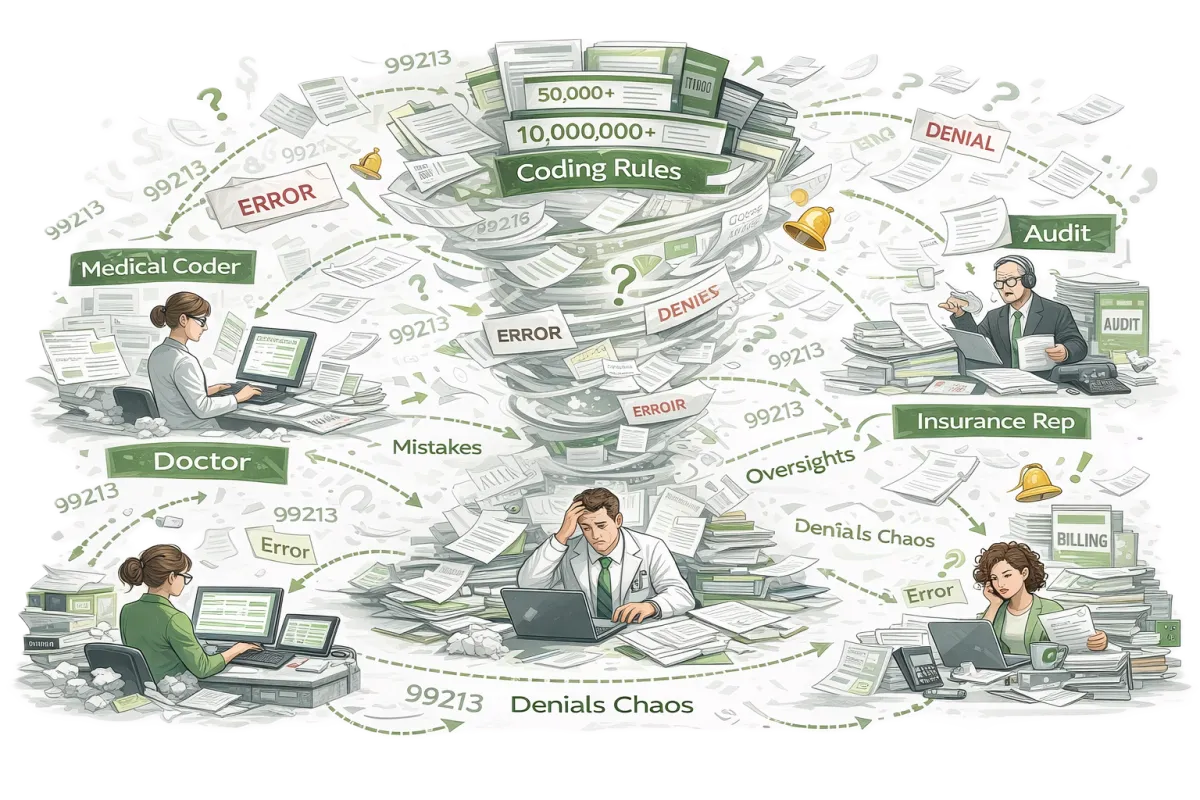 Links symptoms to ICD-10/CPT, and all billing codes using AI refined by clinical context.